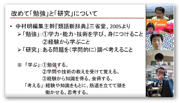 2021年4月〜6月に、福島県の高校生約240名と、大学教員4名で、オンラインで「探求」に関するワークショップを行いました。科学的な探求とはなにか?(「ニュートンのリンゴ」は本当か?)、発想を伸ばすためにはどうすればよいか、という講義やワークショップを行いました。これに引き続き、「SDGs(持続可能な開発目標)と将来の職業」について生徒さんの意見や質問を募り、オンラインで議論を行いました。チームGANTTメーリングリスト 参加者募集中!