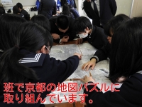 昨年同様、京都の地形を示した同センターの展示地図やデジタル地図をみながら、机やパネルの上で京都のいろいろな場所を探検しました。