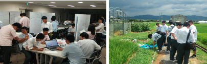 ※左:ワークショップ時の様子。右:野外での地下探査実習の様子