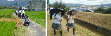 ※左:地下探査実習の様子。右:歴史的神社や「天井川」を歩く。